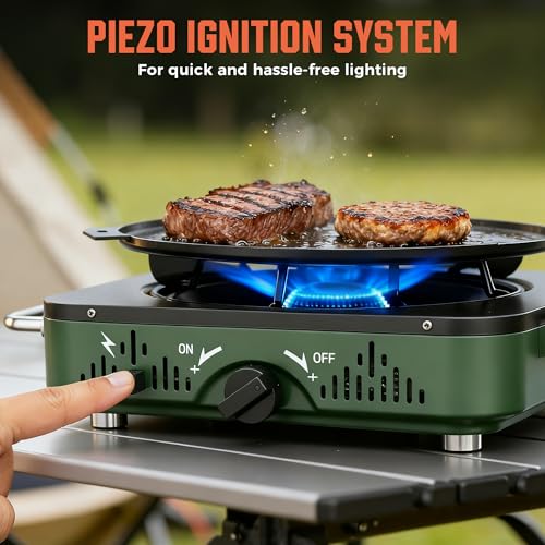 【User-Friendly Design】 Equipped with a convenient piezo electric ignition system, this propane stove for camping allows for quick and hassle-free lighting with just a single button press, and the flame-free ignition enhances safety for worry-free cooking, suitable for beginner. Plus, the camp stove is compatible for propane only