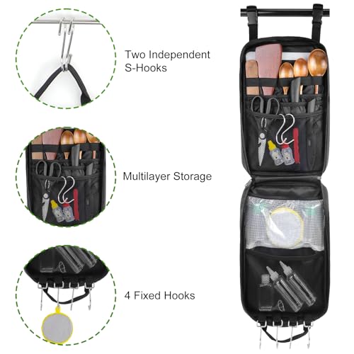 [Instant Camp Kitchen Upgrade] This essential camp kitchen organizer keeps things tidy. Hang it on SUVs, trees or tables with exterior straps & S – hooks. Interior 4 – hook system stores utensils. Ideal for clutter-free camping & RV cooking.