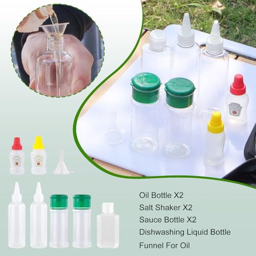 [Spice Like A Pro Outdoors] camping spice kit features empty containers for oil, salt, ketchup, and even soap. Customize with your condiments. Simplify camp cooking and elevate glamping essentials with travel-ready condiment control.