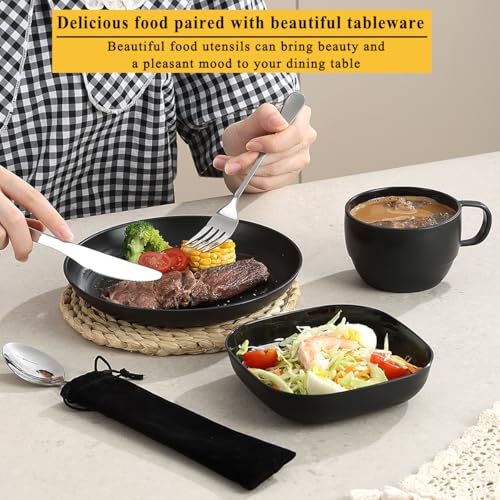 GREAT VALUE SET: Set includes 1 large plate, 1 bone saucer, 1 coffee mug and 1 set of stainless steel cutlery, cutlery includes knife, fork and spoon.