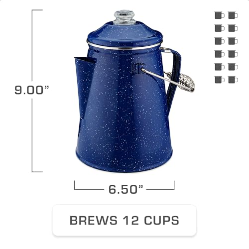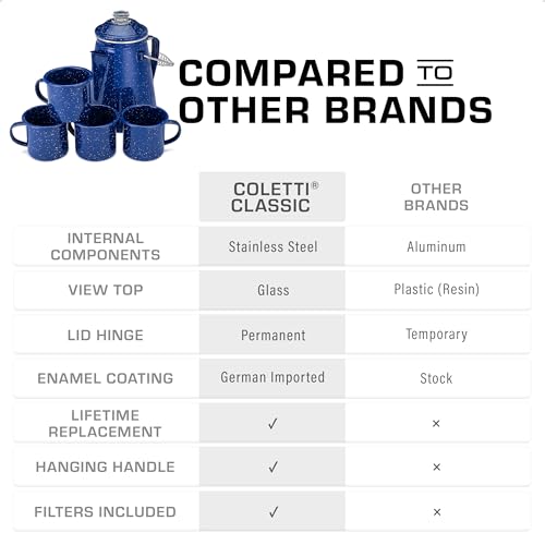 Specification: COLETTI Classic Enamel Set Coffee Percolator & Mugs — The Most Nostalgic Camping Coffee Pot, Now Modernized [Blue Enamel, 12 Cup Percolator Coffee Pot & Set of 4 Mugs]