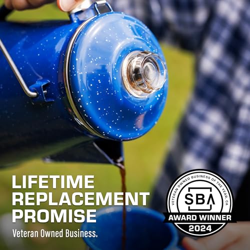 TIMELESS CRAFTSMANSHIP – Built from heavy-gauge steel, every piece of this stovetop coffee maker is kiln-hardened twice at 1,000℉. A handsome blue camping coffee pot built to last