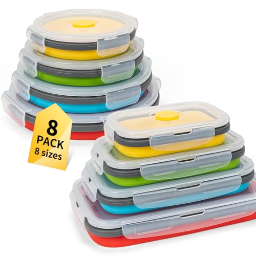 Specification: Collapsible Food Storage Containers with Lid & Air Vent, 8 Pack, 4 Rectangular + 4 Round, Annaklin Foldable Silicone Lunch Containers Collapsible Bowls Set, Microwave Freezer Dishwasher Safe, 4 Colors
